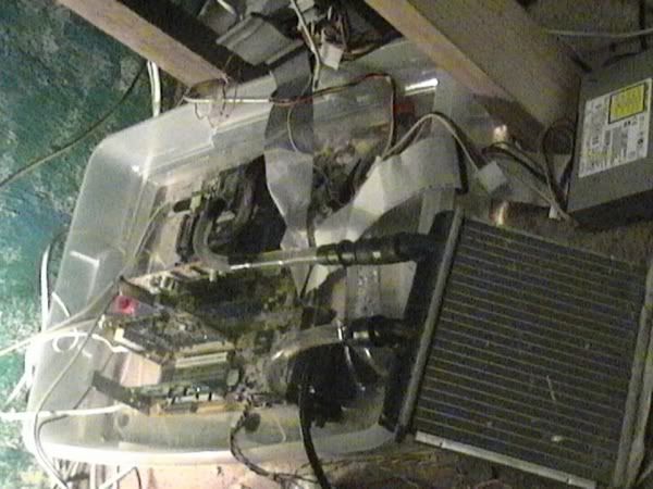 basically the mobo is in a rubbermaid tub with like 30 bottles of "unscented delicate baby oil" with a submersable pump capable of 200gph water and a unknown heater core and a large fan and shroud to cool the oil