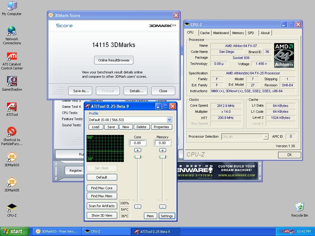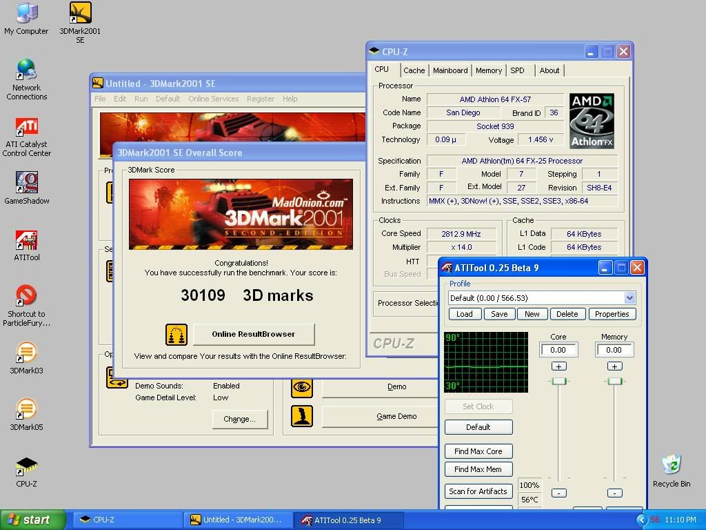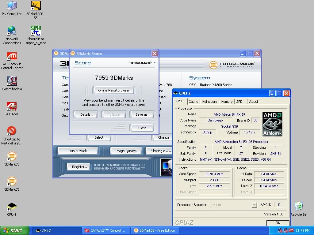 First impressions, this is a big card, heavy too. I started with a fresh XP install, ran all three Futuremark tests starting with default settings on FX-57 & card. 1024x768 for clarity. In the '05 cap you can see W1zzards Beta of ATI Tool which has core voltage adjustment working. Nice job W1zzard.