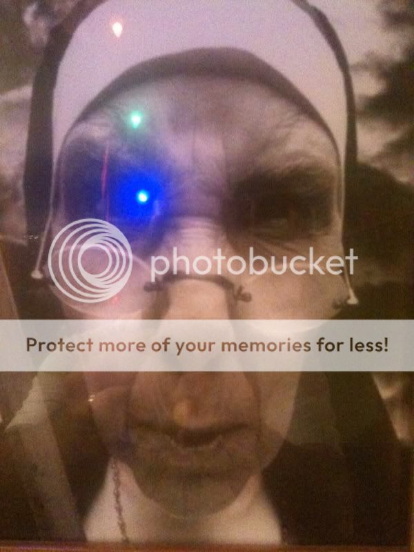 Yea, thats a nun, I took that on the way out of a restaurant called Bucca di Beppo, they have all kinds of crazy art and pictures hanging on the walls, the blue light is a reflection of a light bulb behind me on the glass on the pic. Looks like a Borg Nun. If you look close you can also see my reflection.