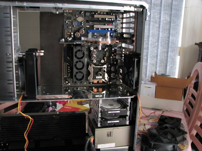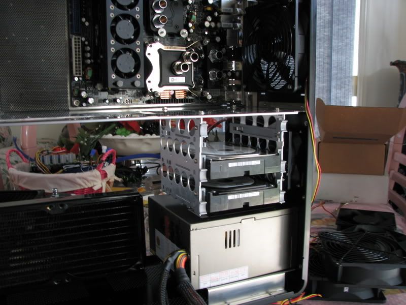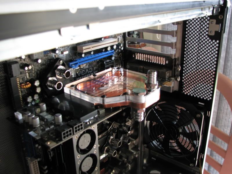 I think you either want to have the rad up there on top of the case or have the little 120mm rad hooked in the back of the case. You make 2 holes for the tubing using a 1" hole saw and your good to go!