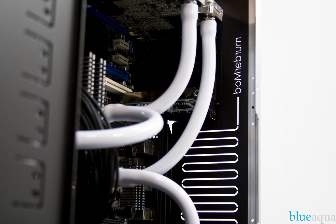 The white hoses strike the perfect contrast against the black interior. Every part of your build is done to perfection; from the sleeving to the LC loop. Your photos too are excellent.