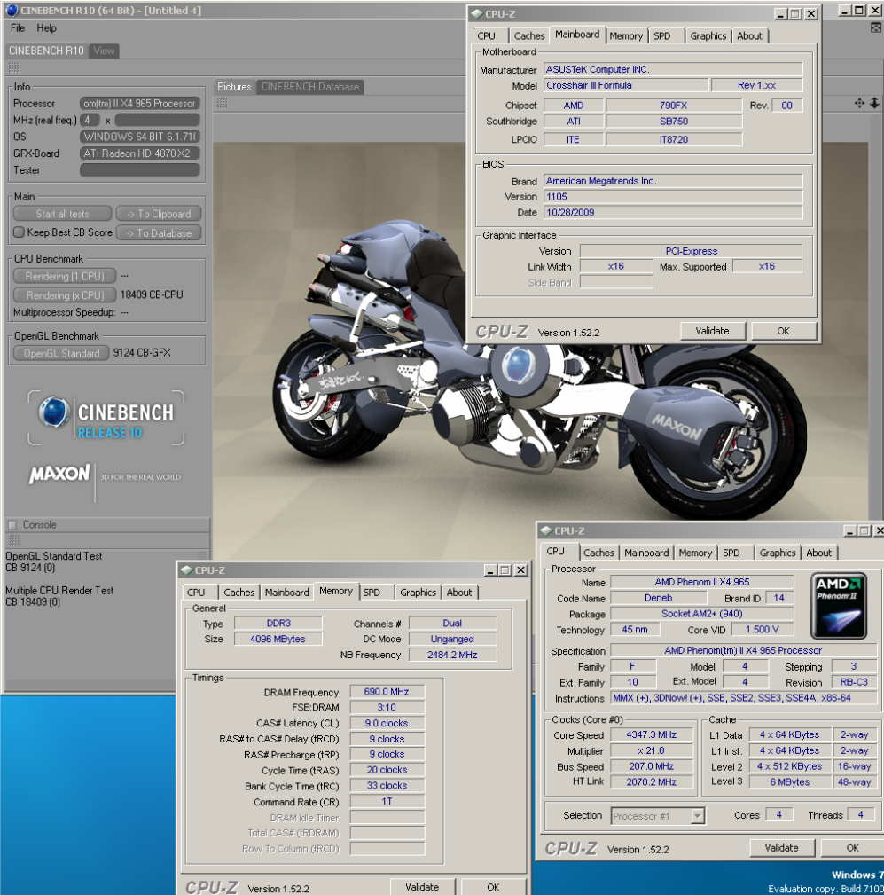 For the 4118 run, I wasn't pushing ram at all. I have 2X2GB Ripjaws DDR3 (see sig). I think it worked out to ~1340 at 7-7-7-21 1T 38 (forget the rest of the subtimings, but I can check when I get home from work) at 1.65v. cpunb was 2000.