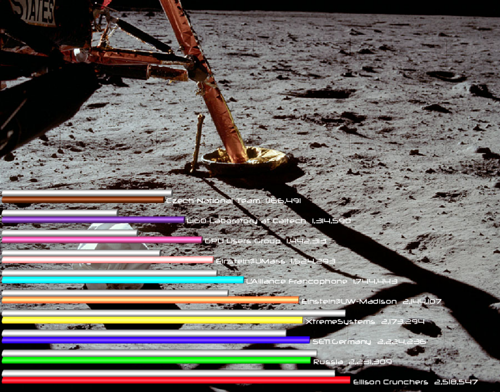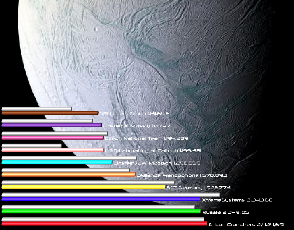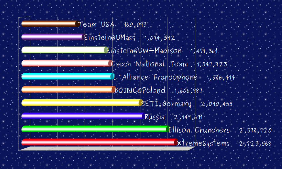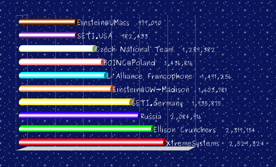 I am going to wind down my Einstein contribution over the next couple days to concentrate all my available crunching resources on helping the XS WCG Team with the fortcoming WCG 10 year challenge.