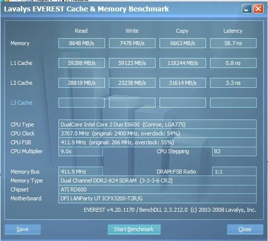 yeah, DDR3 is so much fun to play with. here is another decent Everest bench at a reasonable CPU frequency, still mighty nice numbers. i am just waiting on an X38/X48 motherboard to really unleash some of the DDR3 i have :up: