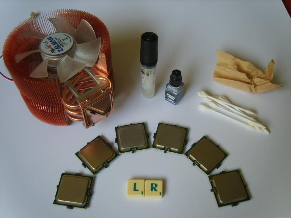 Anyway first pic was taken this afternoon when I had the chips set up - at this stage I had tested four of the chips. Pictured are my Zalman heatsink, Zalman thermal paste, some coffee filters, q-tips and high-purity rubbing alcohol to clean the CPUs/cooler after each install. Second pic speaks for itself.