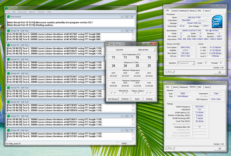 4.2GHz with HT on takes 1.475 VCore in the bios. I could not get there with the zip ties, but the new mount keeps my temps better in control. Might try to go for that later. For now, I've decided to stick with 21x195 for 24/7 use.