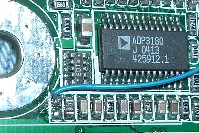 And the mod is basically putting a 100KOhm VR across this pad and ground. Start off with the VR set to 100K and then work your way down to increase Vcore. Works pretty smooth.