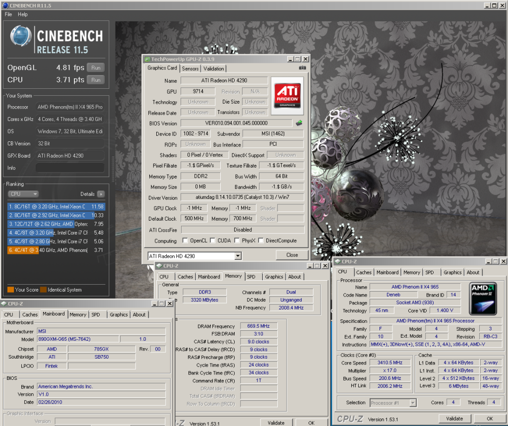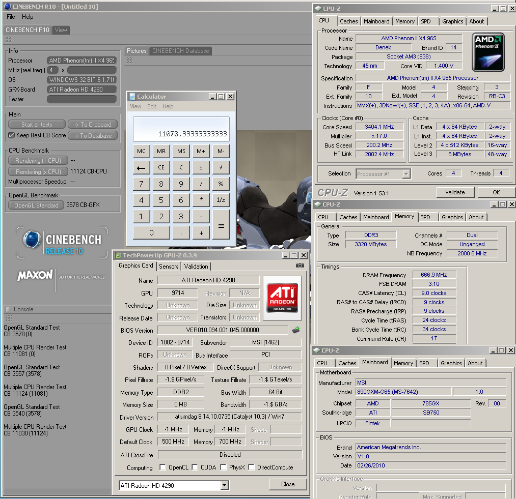 Cinebench 10 three tests to get an average with OpenGL in between each Rendering test.