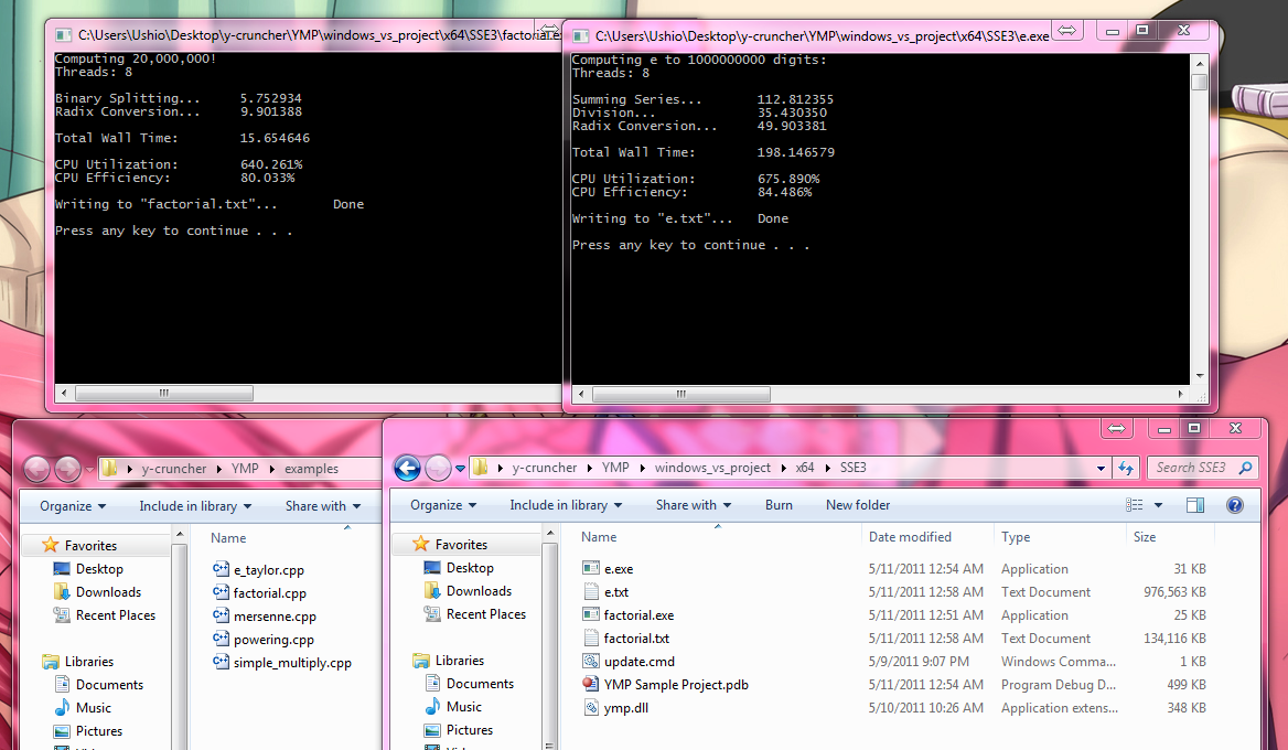 Here's a couple of tiny sample programs. Both examples are under 200 lines and use OpenMP and "ymp.dll". YMP is the name I've given to the library.