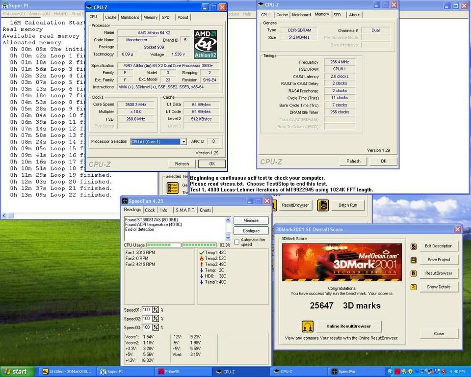 Set PRIME95 to use Core 2, and then set a SUPER PI 16m running on CORE 1, then set a 3dmark01 benchmark running. In the screen shot, you can see the 2 processors still processing PRIME95 (right of CPU Usage) and Super PI (left side of CPU usage) and 3dmark01 has just finished.