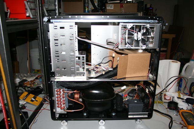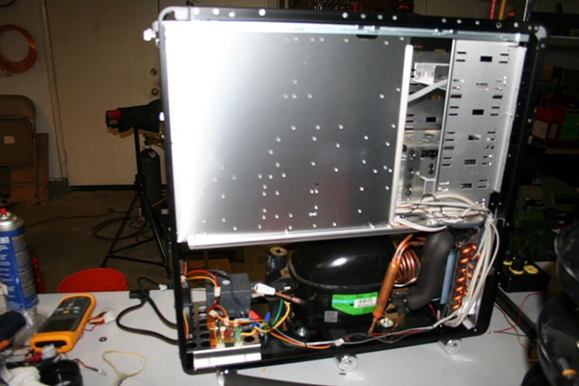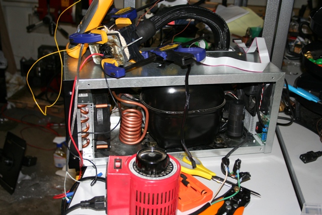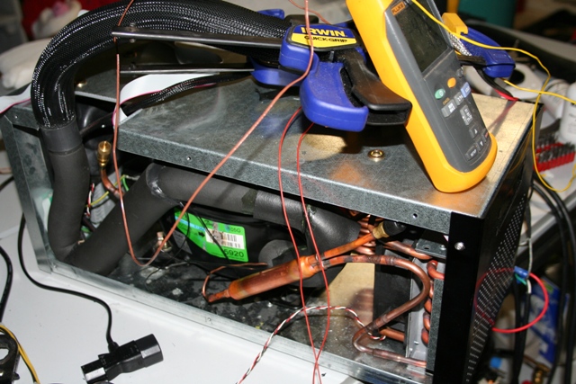 Unfortunately my spare chill control passed away and I have no way to really run it other than hot wiring for now so that's what you will see with both fans powered by 12v psu and compressor just straight connected to ac main.