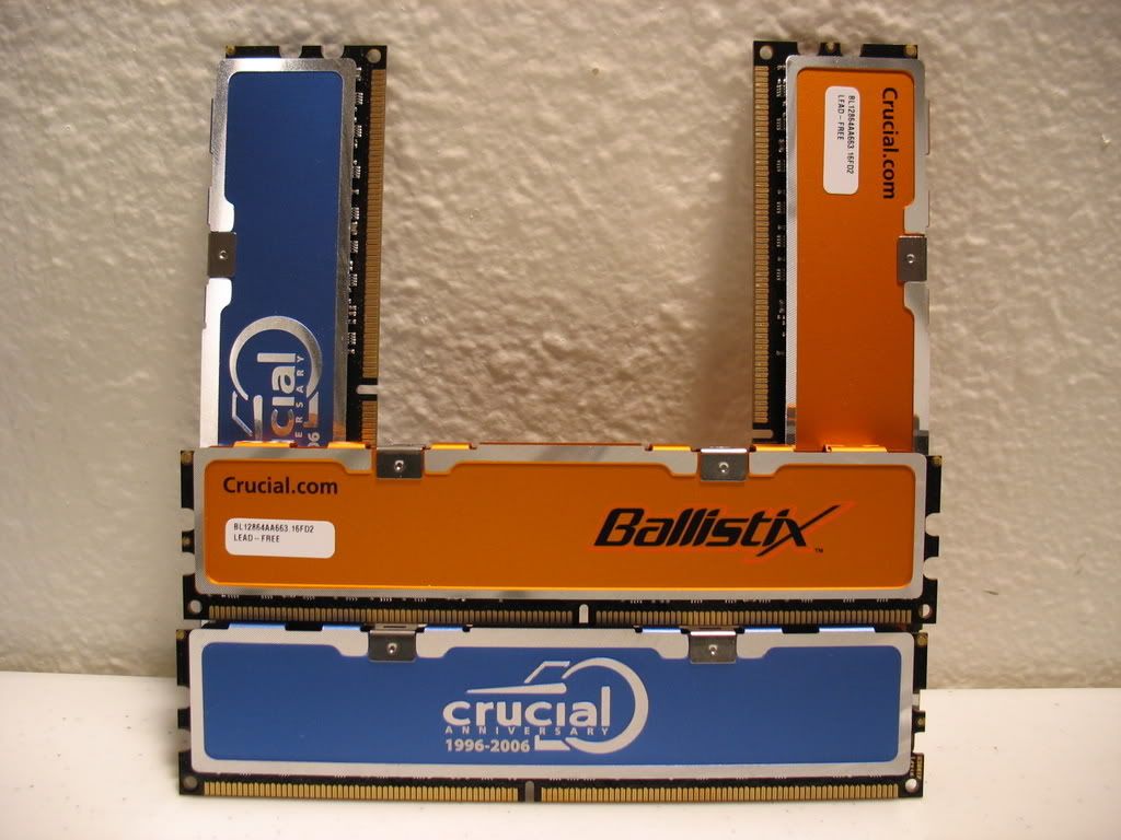 Well one of my 10ths pooped out on me last week. Running stock speeds @ stock volts no less. :( I had some Corsair DDR2800 CL4 EPP from a friend, but they caused mad issues when attempting to OC my CPU. Rather than deal w/ newegg, I decided to see what Crucial would do since both were OOS. They agree to cross ship the reg Ballistixs overnight. Here's pics...results soon.