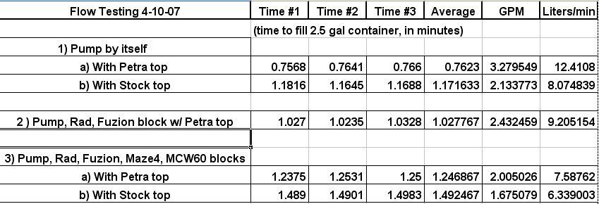 I'm flow testing my loop before putting it in the machine. Figured I’d add the data here since it involves Petra’s top. I’m strictly looking a flow, with full power to the pump. I used the actual parts of my loop to get a feel for what the pump does on it’s own vs what load the loop puts on it.
