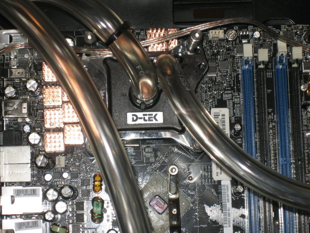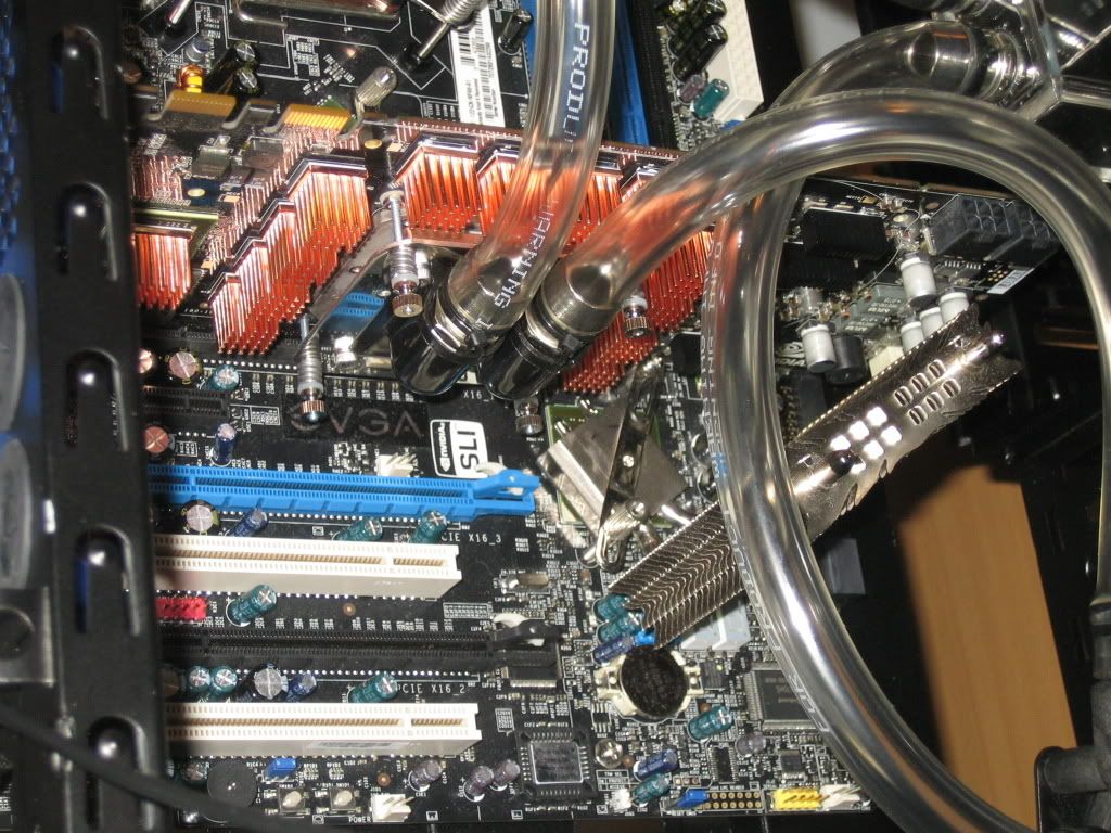 Sorry about the lack of updates. The camera's batteries were flat, and weren't charged until about 6 pm, so unfortunately you don't have pics of the loop installation. However I'm sure you've all seen enough pics of FuZion waterblocks and naked 8800GTX's with MCW60's that you aren't missing out on too much. Funnily enough, I didn't have to cut down any of the Enzotech Ramsinks in order for them to fit underneath the MCW60 barbs. The Enzotech ramsinks JUST touch the tubing, but it's not putting any pressure on either, so it shouldn't cause any trouble.