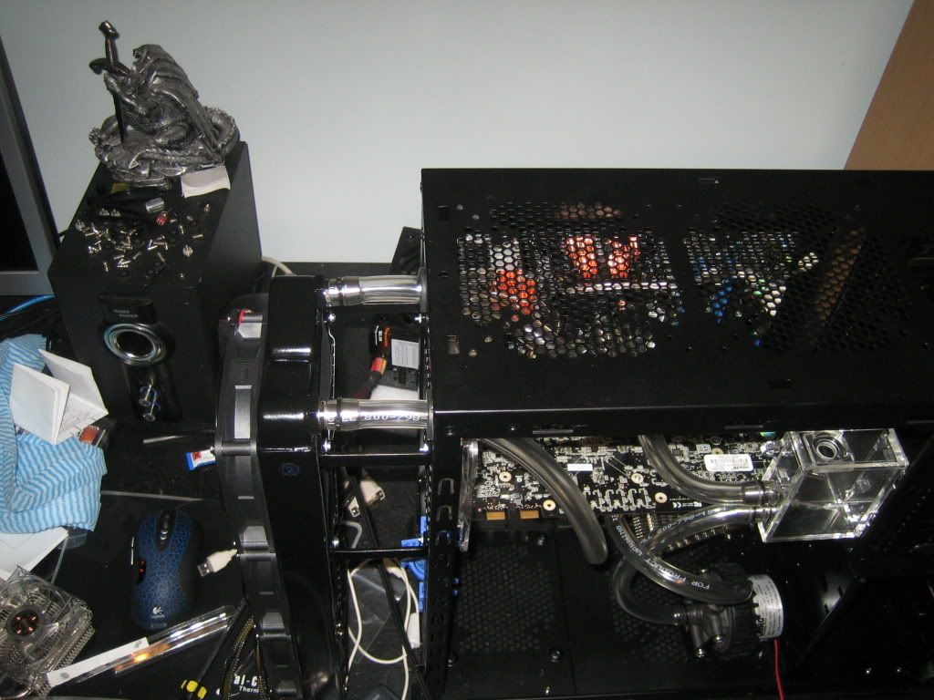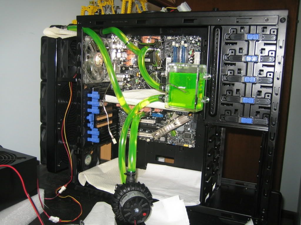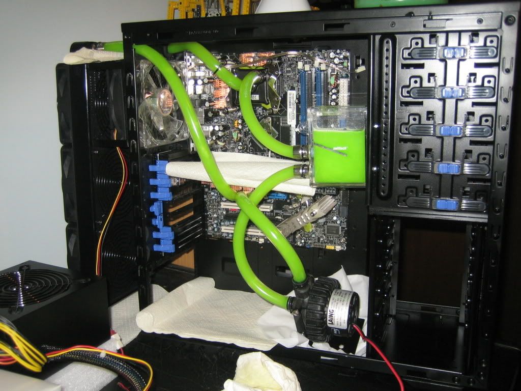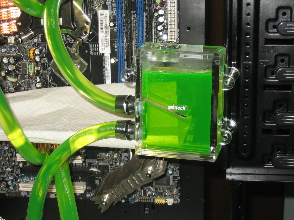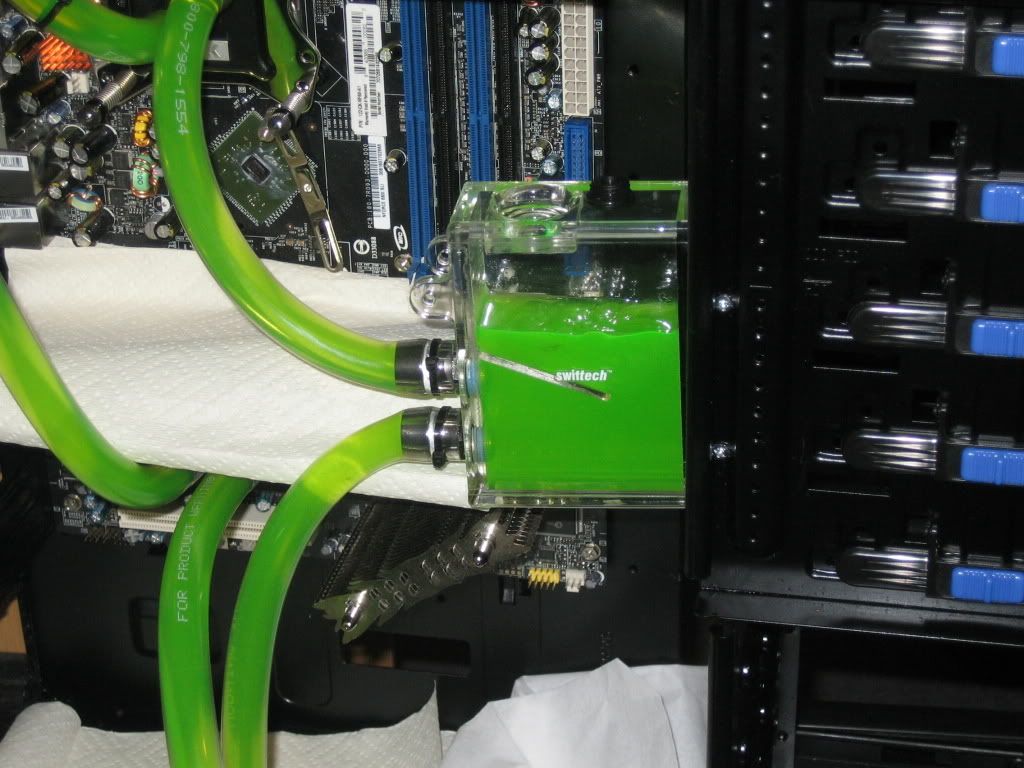 Well obviously the loop is installed, and has been running for the past 3-4 hours. Most of the bubbles have bled out of it, and it's looking really good. The Swiftech HyrdX looks really nice, and glows well under UV lights, or even blue LEDs. Tipped the case around a couple of times, and so far doesn't look likethere are any bubbles hiding in the radiator or waterblocks.