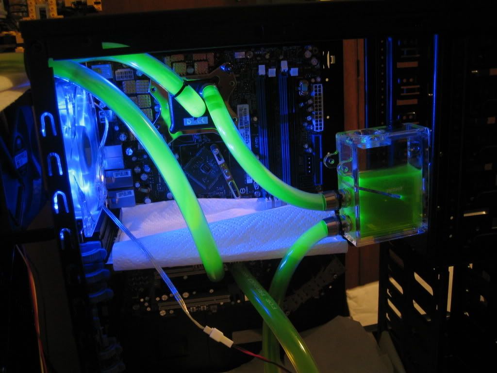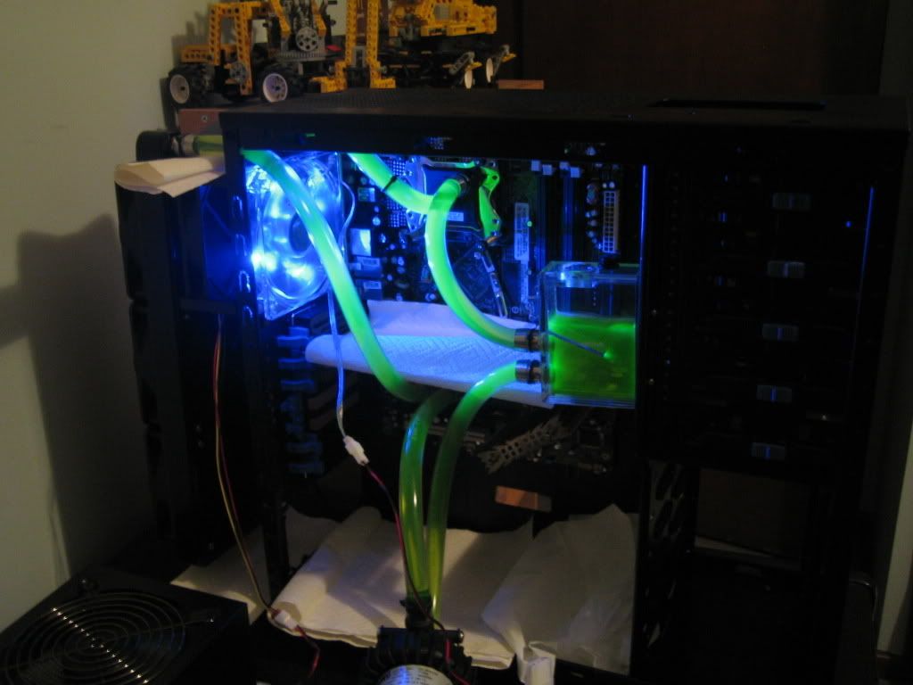 This gives you a bit of an idea what the loop will look like when it's finished. All it's lit up by is the LEDs off that 120mm fan. Those LEDs are pretty much pointing towards the water loop, which is why it's so bright. When I'm done, there will be a couple more fans, plus some UV cold cathodes.
