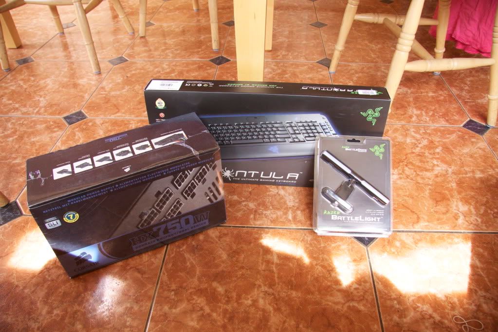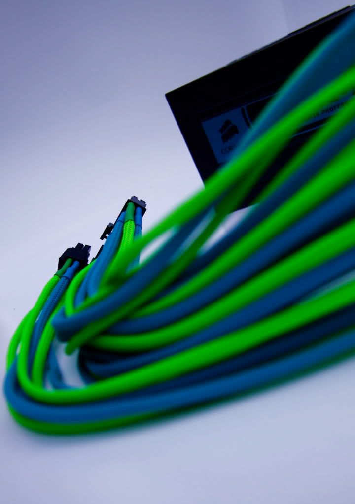 Since my last update, iver ordered a new modular PSU (Cossair 750W), new keyboard (razer tarantula) and Murdermod's finest green and blue sleeving, here are my pictures! excuse the quality, my new hardware was taken with a crappy point and shoot camera, and the pictures of the braided cables where taken on a piece of paper without my studio lights, more picture will follow next week when i have my lights, and its in my case!