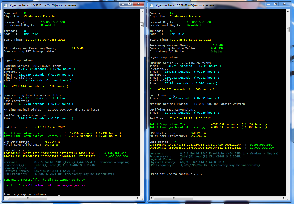 y-cruncher results 25,000,000 thru 10,000,000,000