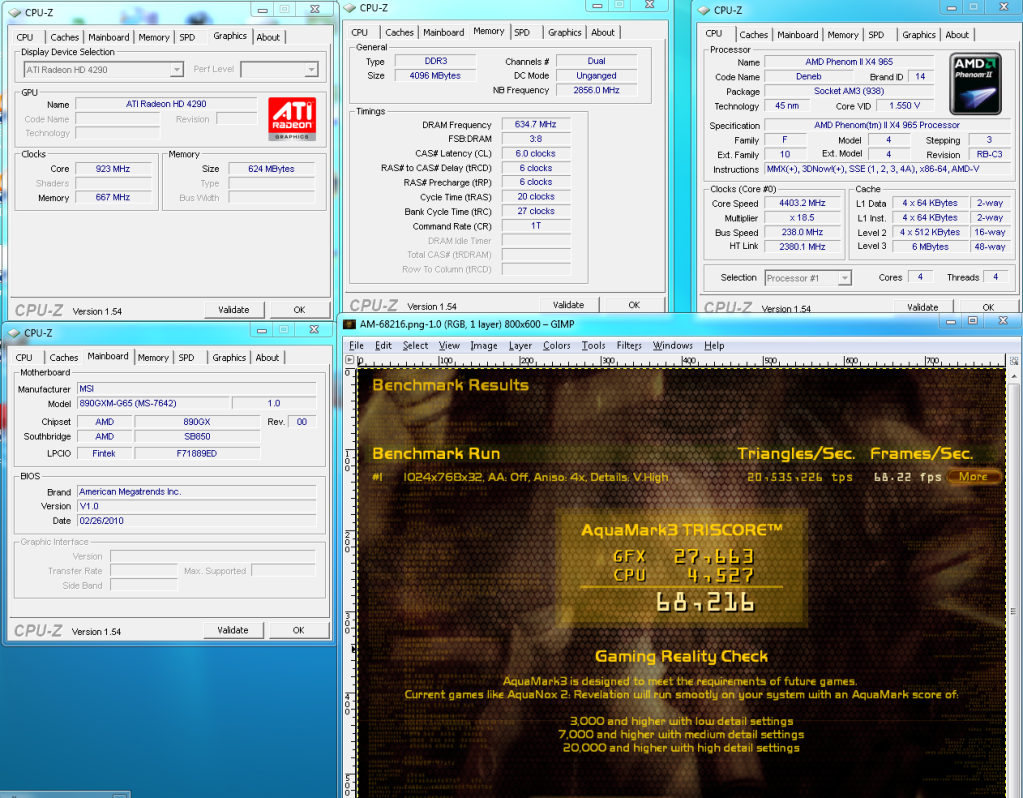 AquaMark3 creates a folder in the pictures library and saves the pictures as files with.tga file extension in that folder. Gimp will open these files as seen in the posted screen shot of the AquaMark3 test below.
