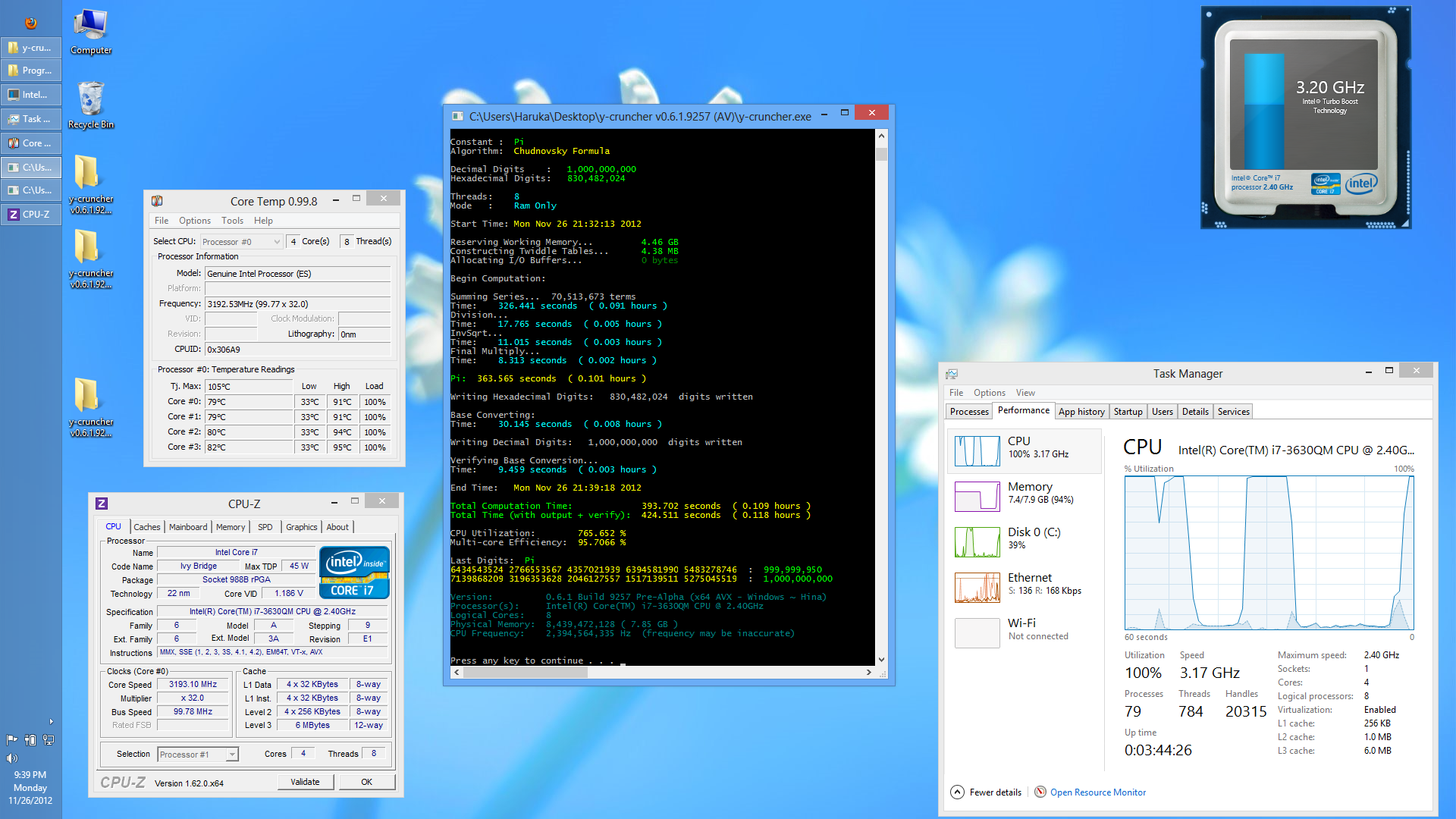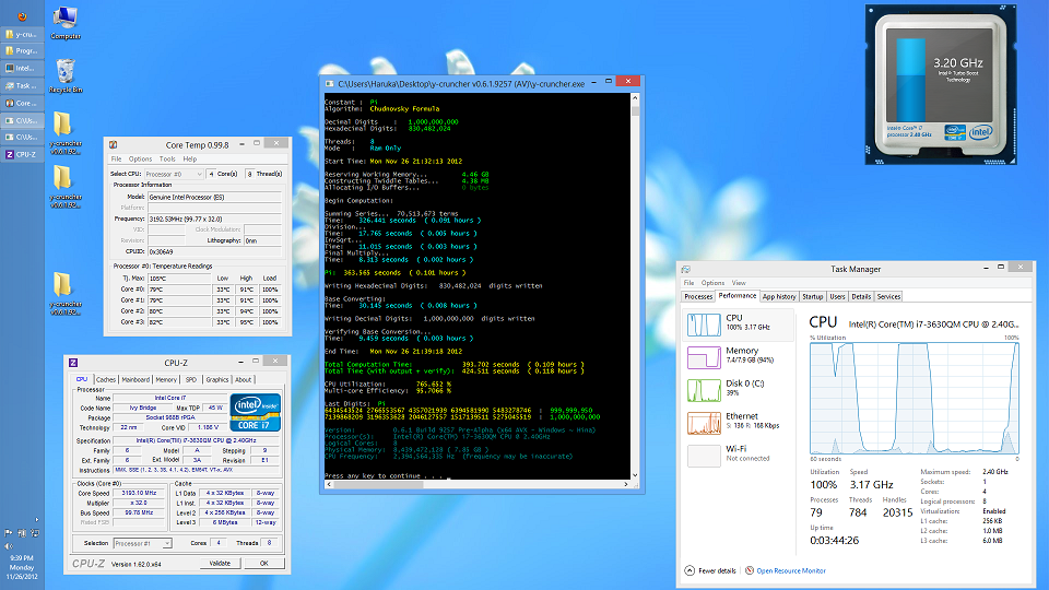 This is not the place to go deeper in I/O, but I used the PCs to let it compute Alex Yee's excellent ycrunch application as a background task. (All runs in memory were on an otherwise idle machine)