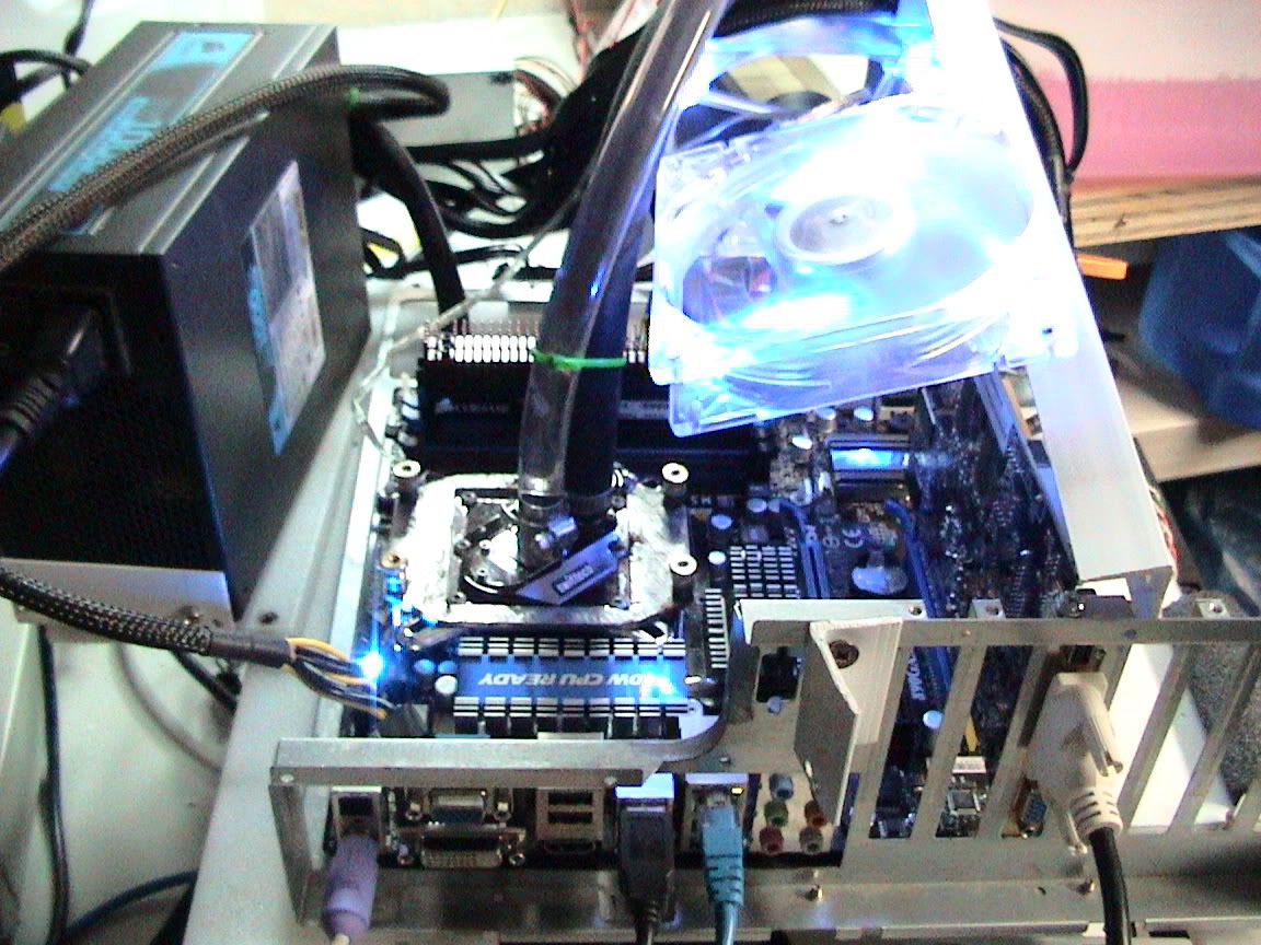 1 X 120 GPH 120v pond pump (self priming) in the coolant reservoir to feed the CPU water block.