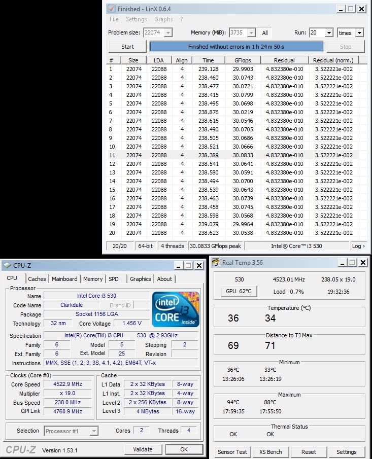This cpu is the hottest thing this side of the sun. My zalman 9300 just cannot cope with it. Load temps are ridiculous. 4.52 HT on @ 1.32v gives load temps of 97c in linx. Hoping to get water fitted this weekend, may be held up if the res doesnt show in time. Likes the 19x multi, getting 60mhz more cpu same volts compared to any other multi. Limited by bclk now, cant figure out whats stopping me. Could just be P55 limitation, not seen any other P55 rigs running 235+ 24/7 stable.