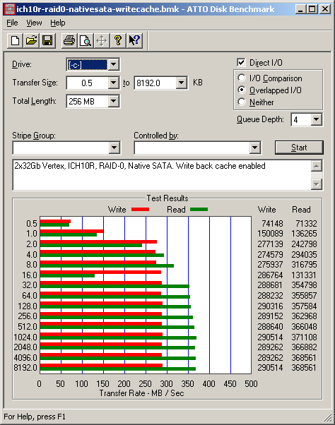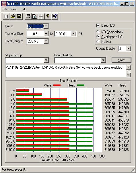 2x32Gb Vertex on ICH10R RAID0, Native SATA mode on, write-back cache ON.