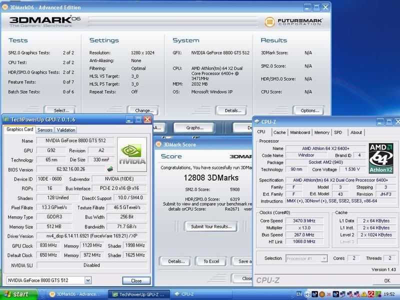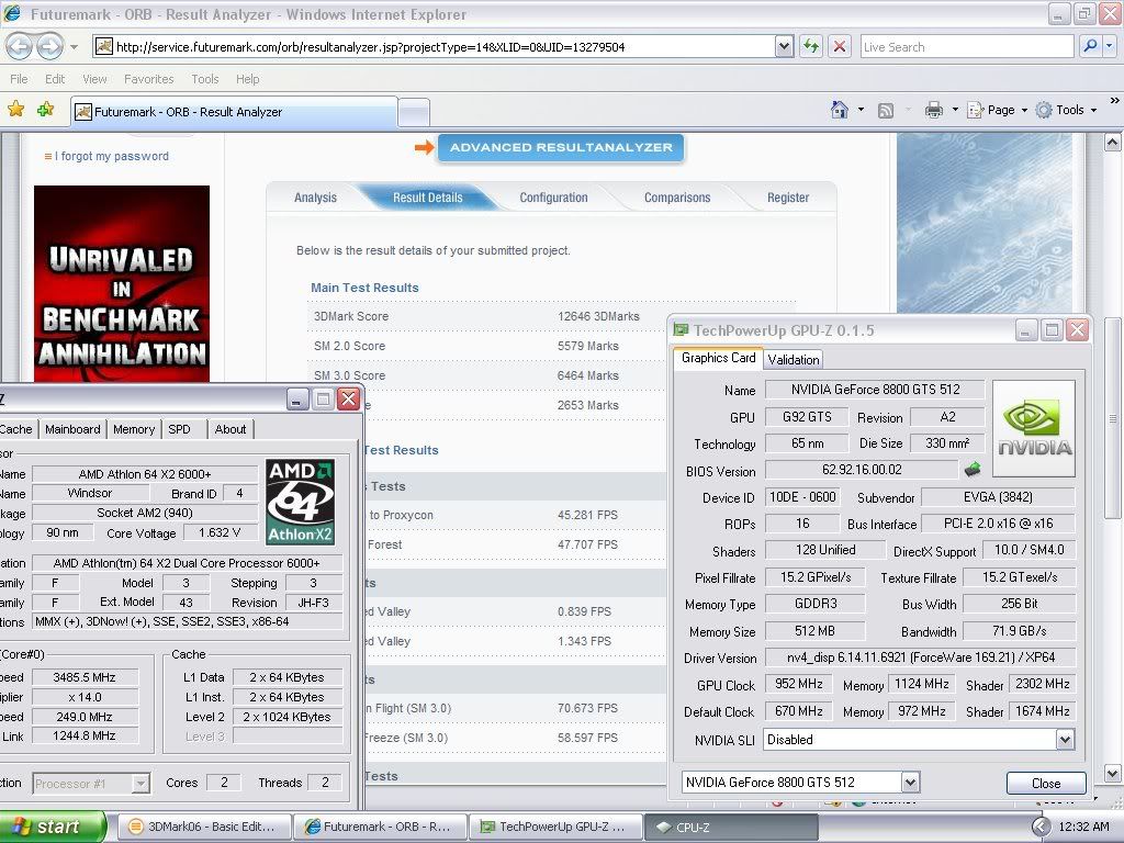 Working out some bugs....I installed the 1603beta Bios for M2N32deluxe..Its not that great...i can Only do 12600+3Dmark06 even with these clocks...My SM 2.0 and SM 3.0 are 5500+ and 6000+!!!!...my CPU score is 2653....Im getting a driver bug BSOD with the 169.21 WHQL driver X64bit..im checking a few things but i used to get 13000+ with the 1201 bios and same settings...It has me puzzled because @stock Nvidia clocks with the same CPU clock,, it benches 12250!Ill keep yall posted:D The card isnt overheating..The sm scores keep scaling higher up:shrug: