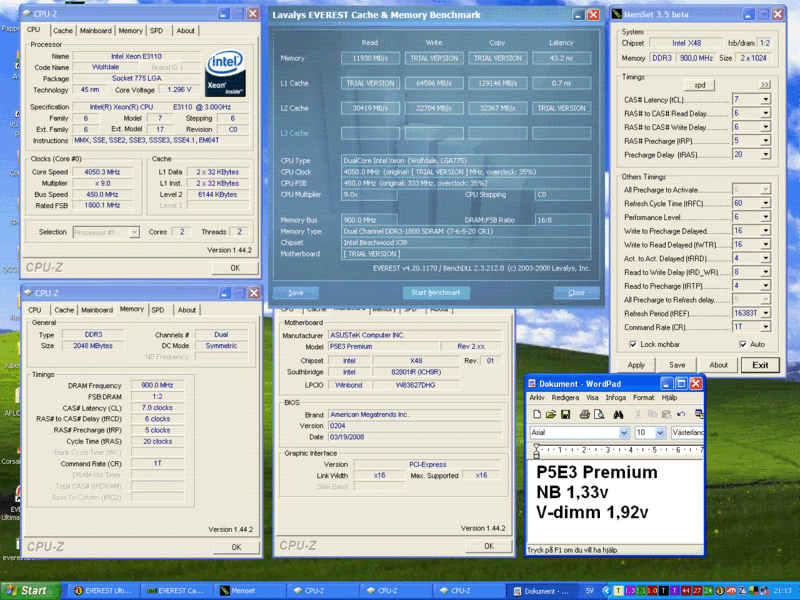 The P5E3 premiuim on the other hand is an amazing board. I havent tried overclocking just yet, but by the looks of the bios its gonna be fun. Im going to try to hit 4.2 Ghz with an E8400 and Freezer Pro 7 so ill update in a bit guys. Also, has anybody hit 4.5Ghz with water cooling or air? That would be a triumphant task.