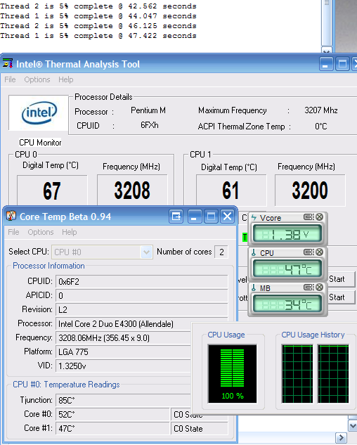 I am reasonably sure that CoreTemp is NOT reading temps correctly as they do not correspond with Speedfan that I have adjusted to match coretemp when using my e6600 (using +4C offset) and I am positive that the CPU rebooted when running @ 3.60GHz due to exceeding its operating temp