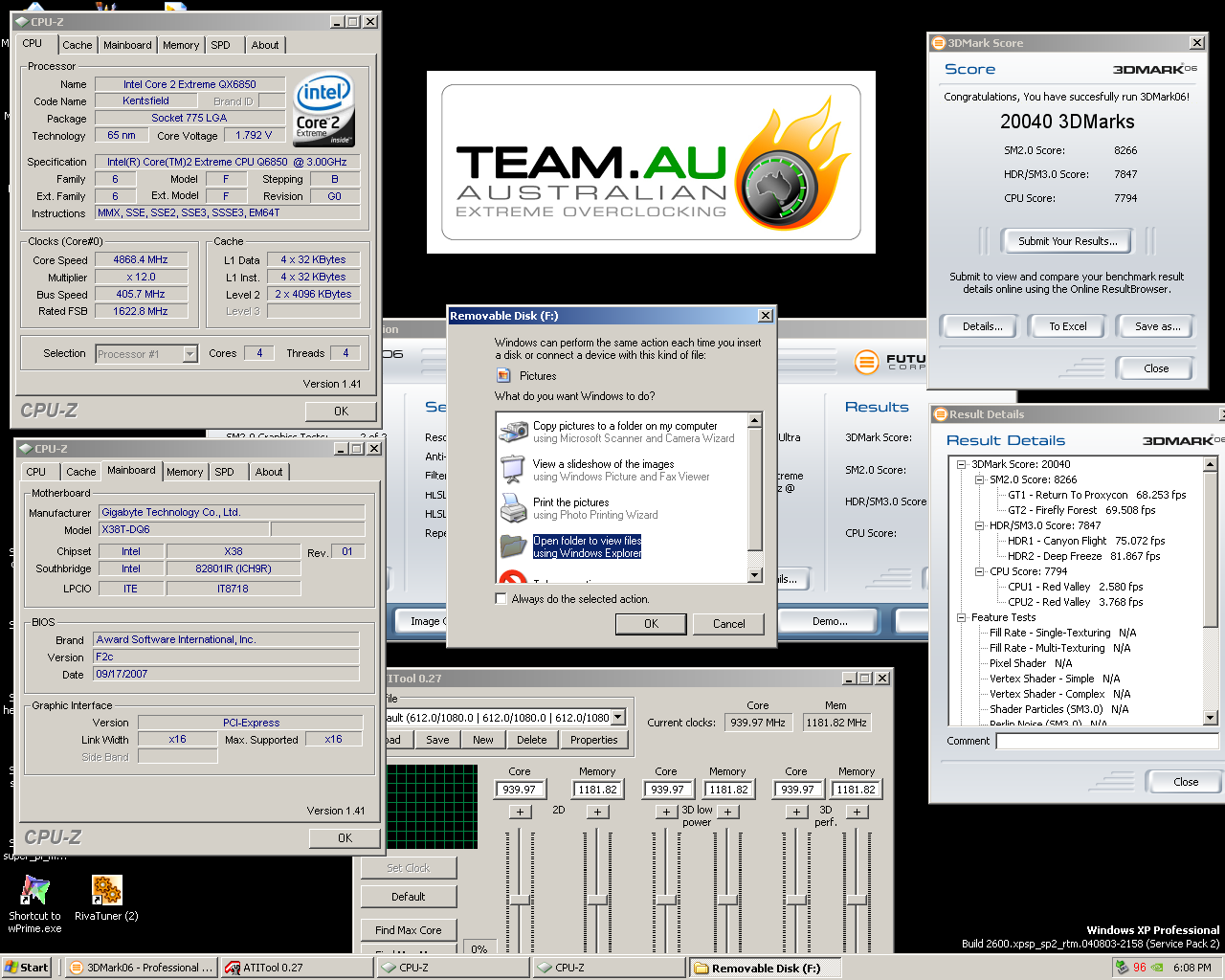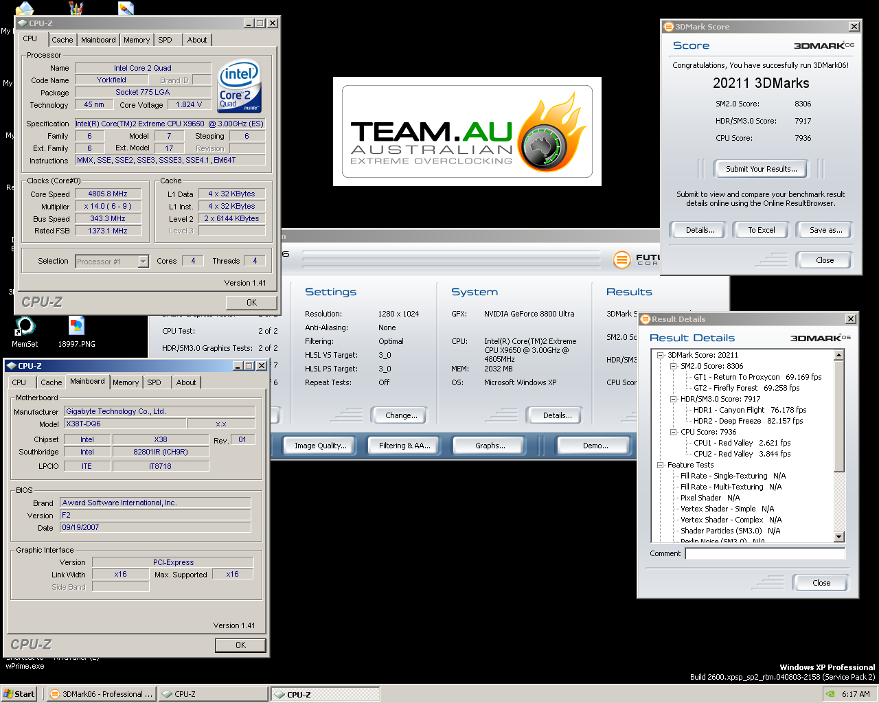 The hardware used throughout the day did very well to hold up for such lengths of time on huge volts, high overclocks and freezing temperatures. Of particular note in this respect was the performance and stability of the GIGABYTE X38T-DQ6. After having average P965 boards and seeing an improvement in P35, the new X38 boards are starting to leap ahead. It also helps that GIGABYTE is actively communicating with the best overclockers throughout Australasia, Europe and north America.