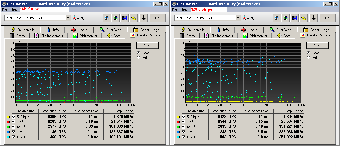 Using ASUS P5N32-E SLI Plus w/onboard nVRAID, I tried all stripe sizes available. I re-imaged the array with a basic XP SP3 install each time, gave the system a few minutes to settle, and ran the tests.