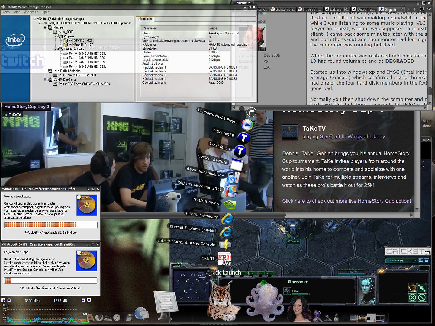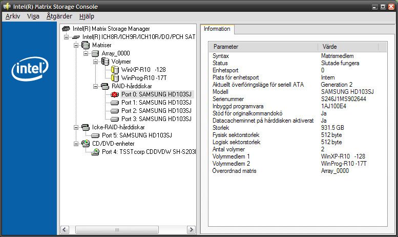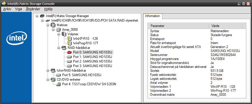 Edit: 2014-01-16 0-2:3x500GB Seagate Barracuda 7200.10 16MB cache firmware AEK on Intel Matrix Storage Manager with 128GB RAID 0 128k stripe and 850GB RAID 5 gone bad