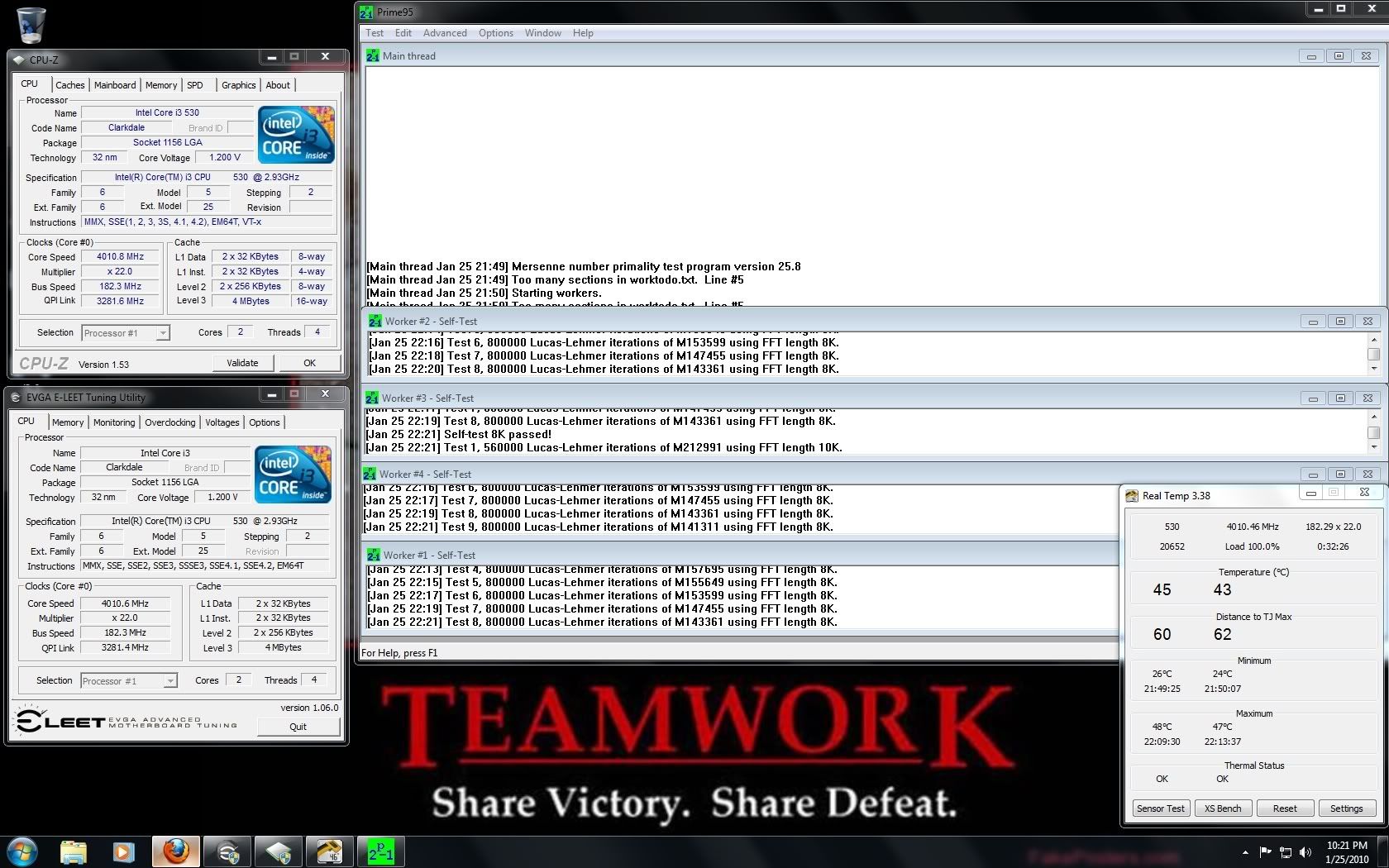 4ghz is 8 hours prime stable at stock voltages, 4.3ghz looks like it will be the sweet spot as it runs with 1.2875v Vcore, 1.2v VTT. I just have to test it in my evga H55, but i have to head back to microcenter tomorrow as the kit of ram i have for that board was DOA. multiple errors in memtest86+ even at reduced speeds and timings paired with increased voltage 4.4ghz was able to run for 30 minutes in Prime 95 @ 1.35v Vcore, 1.35VTT. once i get the replacement kit of ram, ill try for another 8 hour run and i still have another .05v on the vcore and vtt until i leave the "safe zone"