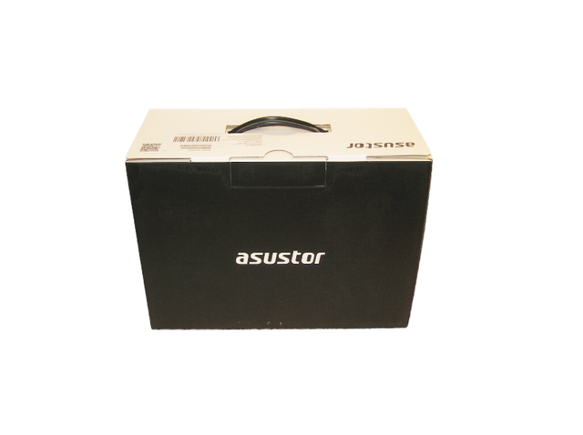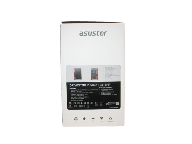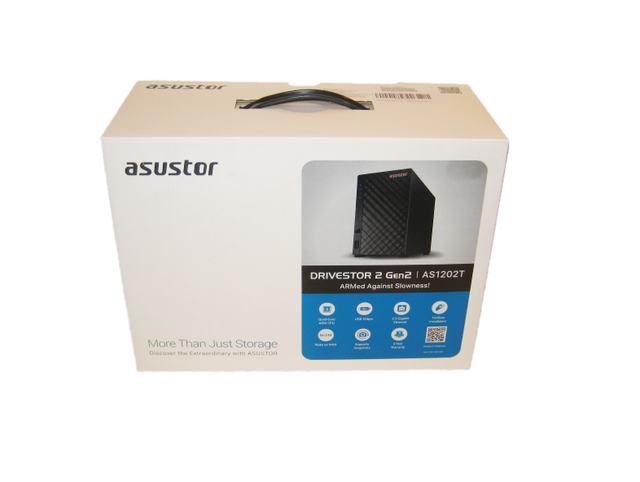 Asustor Drivestor 2 AS1202T is delivered in white box packaging, label to the right, offering model identification alongside hardware features. Key features of the Asustor Drivestor 2 AS1202T include quad-core processor, external 3x USB 5Gbps ports, 2.5 Gbps wired connection, tool-less installation, Wake on WAN, silent design, and a three-year warranty. It has a carrying handle, so you can easily move it around.