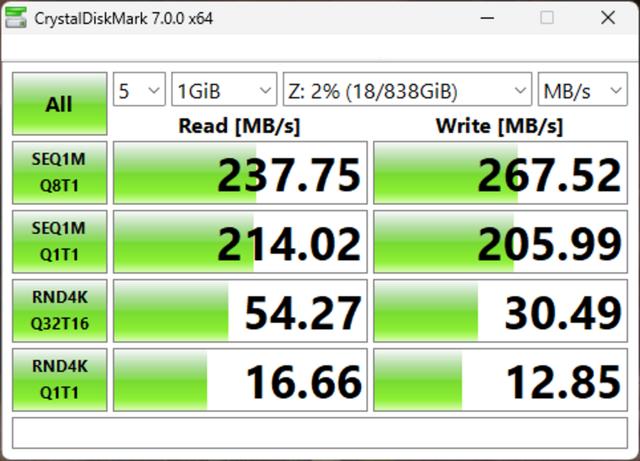 We can take advantage of the 2.5 GbE network connection, achieving transfer speeds of over 220 MB/s.
