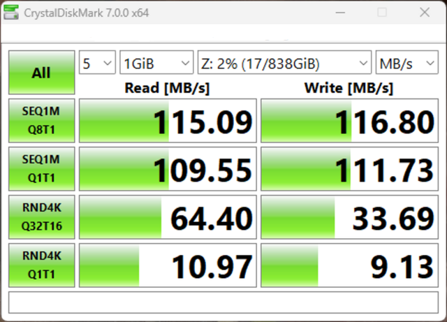 As we expected, with a single HDD unit the maximum transfer rates will be around 115 MB/s for reading and writing , not taking full advantage of the 2.5 Gbps link.