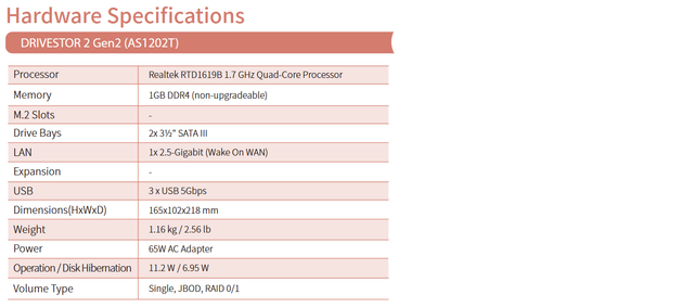 A label at left side of the box offers full hardware specifications along with package contents. Zoom in to see the hardware specifications. You can see that this Asustor Drivestor 2 AS1202T uses Realtek RTD1619B 1.7GHz quad-core processor, and the memory is 1GB DDR4.