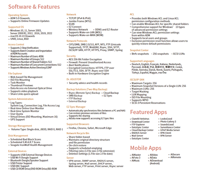The right side providing the main features, including the use of ADM operating system, functional design for enthusiasts, life-like applications, built-in monitoring center, etc. In addition, Asustor also provides cross-platform and mobile APP capabilities.