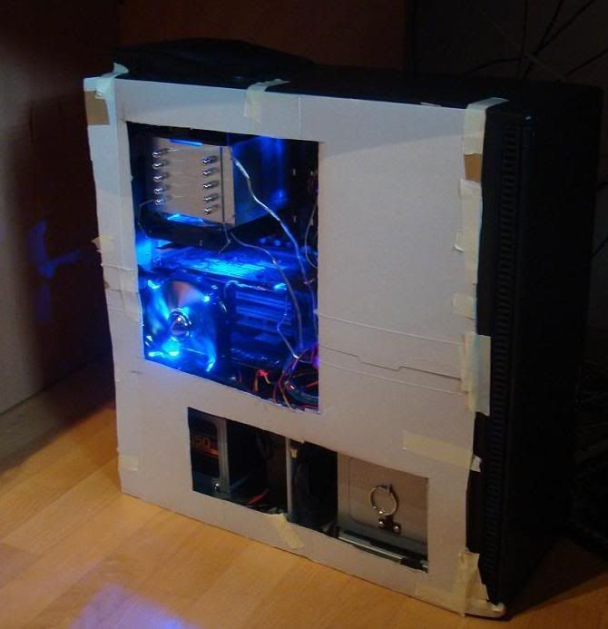 As mentioned, everything will be internal. This means that I have to do some modding to the case and I'm planning to make 2 windows - one in the motherboard area and one by the radiator at the bottom. I've planned it out using two cereal packets that I've glued together and cut holes in. I was out of other materials at the time, don't worry, the final result will look professional (hopefully) and all the cables will be moved away.