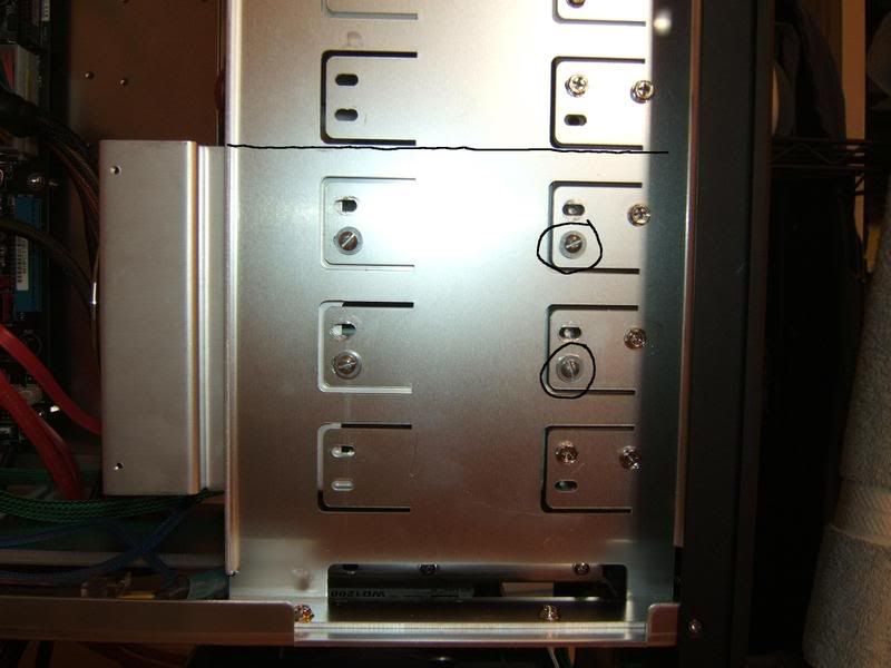 I then added my hard drives to the cages. I have 4 hdd so it was necessary to use both cages. One of them is a backup storage drive and happens to be ide, I was hopping to be able to mount the one cage up in the 5.25 area but was unable to quickly figure out a way to do so and scratched that idea. I may look into doing this later but not caring too much now.