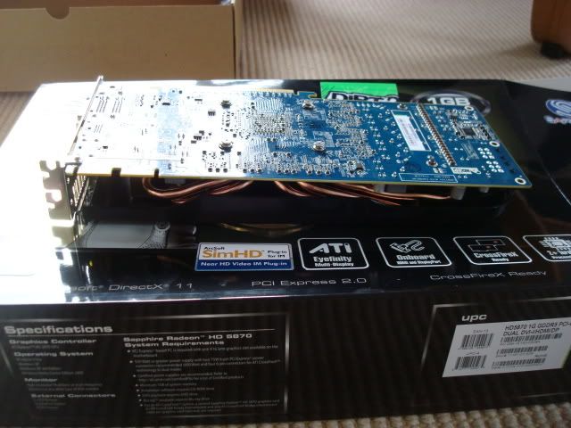 Well as my 9800GTXs died i went ahead and got a Sapphire 5870...i didnt realize they stopped making reference cards so the card i got was damn ugly as you will see below, I was going to send it back however that mean more time and money to get a different card etc...so i popped it in my machine and all i can say in terms of performance is WOW..it completely destroys even my two 9800GTX so im happy