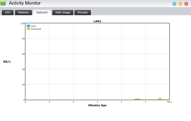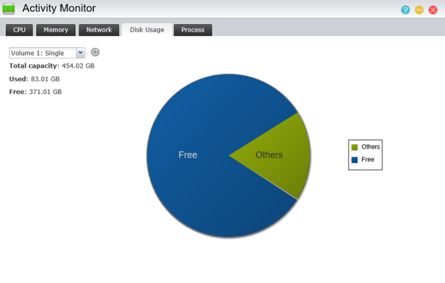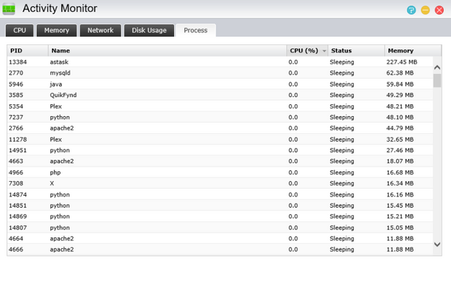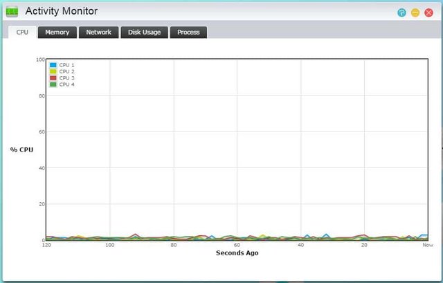 The activity monitor presents everything you need to know about what your NAS is doing in a very slick way. The percentage of each CPU (core) is displayed graphically, as well as memory, network activity, disk usage, and running processes.