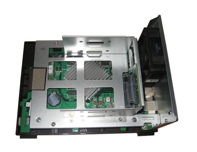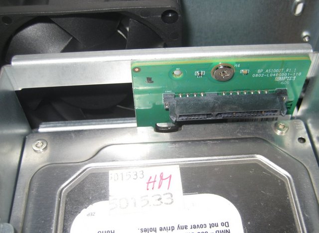 The tiny daughter-board inside the HDD cage provides SATA Data/Power connectors for each bay.The motherboard in itself is very simple and there aren't many parts on it.