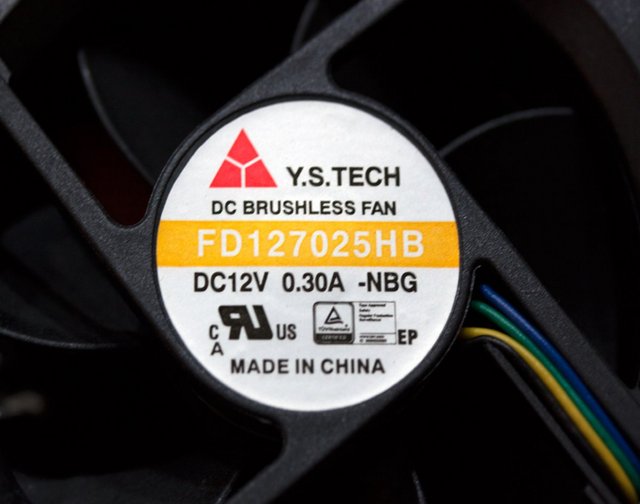 The fan is from Y.S. Tech FD127025HB.It is a 70mm dual ball bearing fan specified at 0.30A for a maximum of speed of 5000 rpm. The rated airflow is 40.5 CFM and 7.2 mm-H2O static pressure at 41.0 dB of noise.