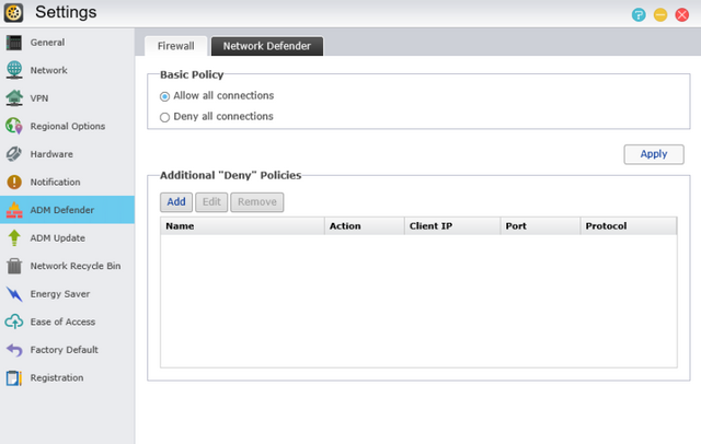 ADM Defender area takes care of the Firewall options and Network Defender will allow us to specify trusted/black lists.