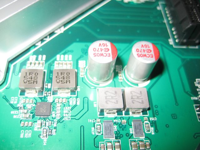 The CPU is powered by a 2-phase buck regulator, and the filtering caps are by Apaq.