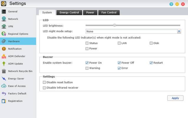 The Hardware area will allow working with LED options, Buzzer behavior, adjust Power Management options for the system and drives, more Power options and also Fan Control.