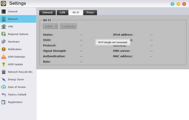 Next we've got the Network settings available along with Wi-Fi (if a compatible dongle is connected) and Proxy settings.