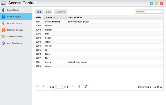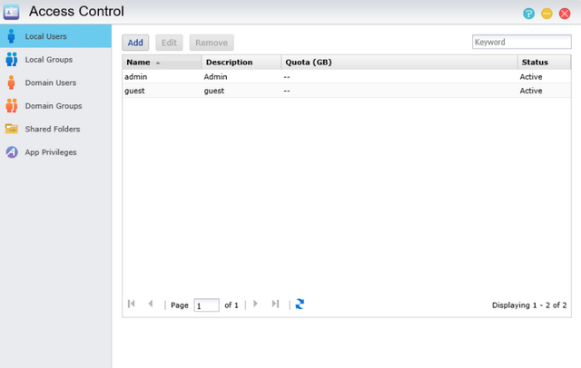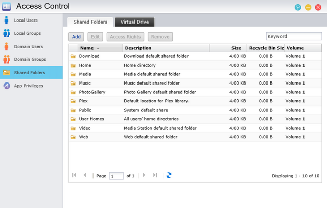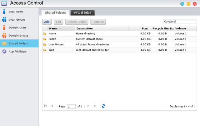 Access control is where your users, groups, app privileges, and shared folders reside. Users can be added with just a few clicks and groups can be assigned just as easily to make administrating access to shared folders easy. Shared Folders can be created and added in no time at all and allows for advanced user access permissions.